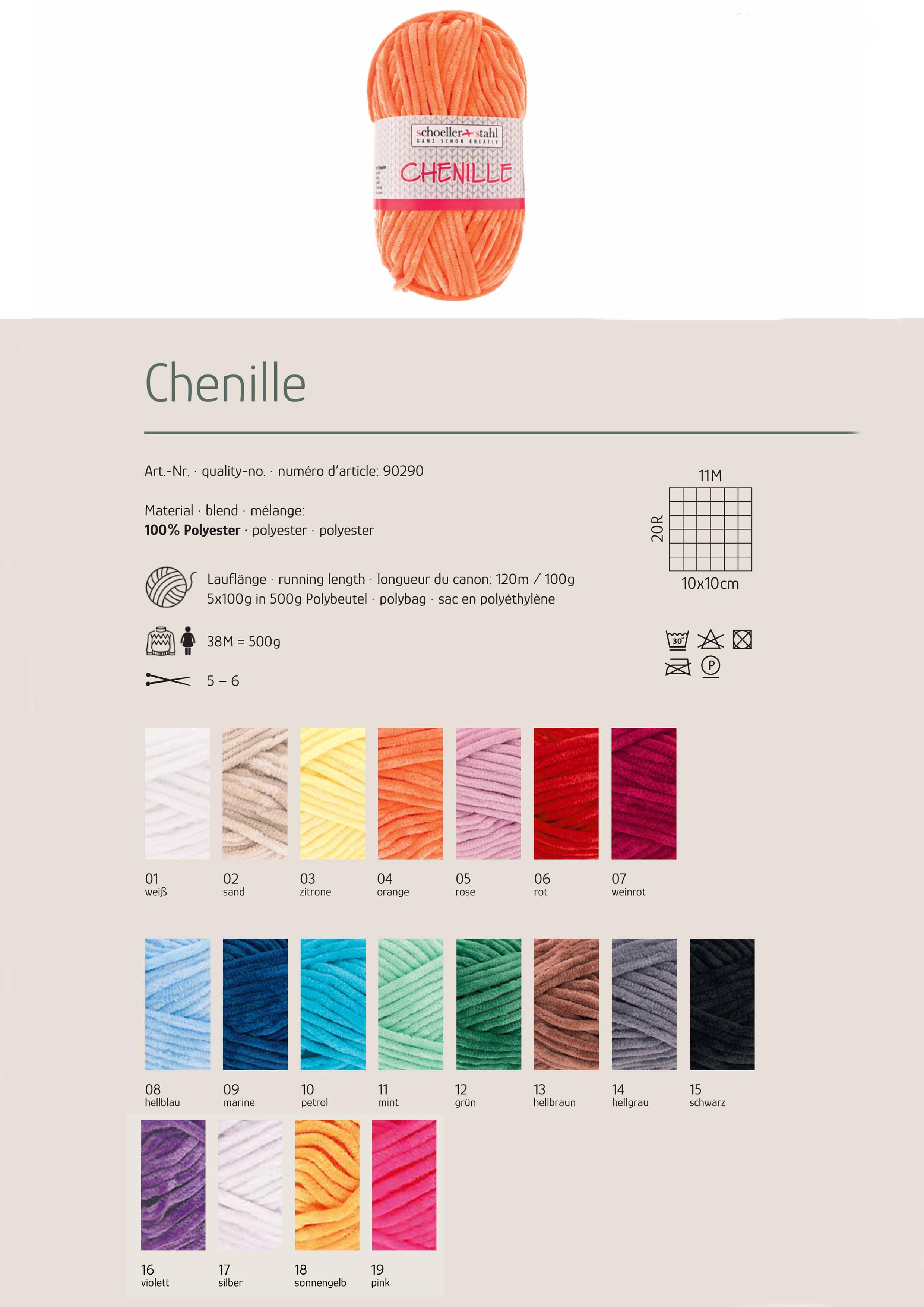 Zusammensetzung:100% Polyester Lauflänge: 120 m / 100 g Nadelstärke: 5 - 6 mm