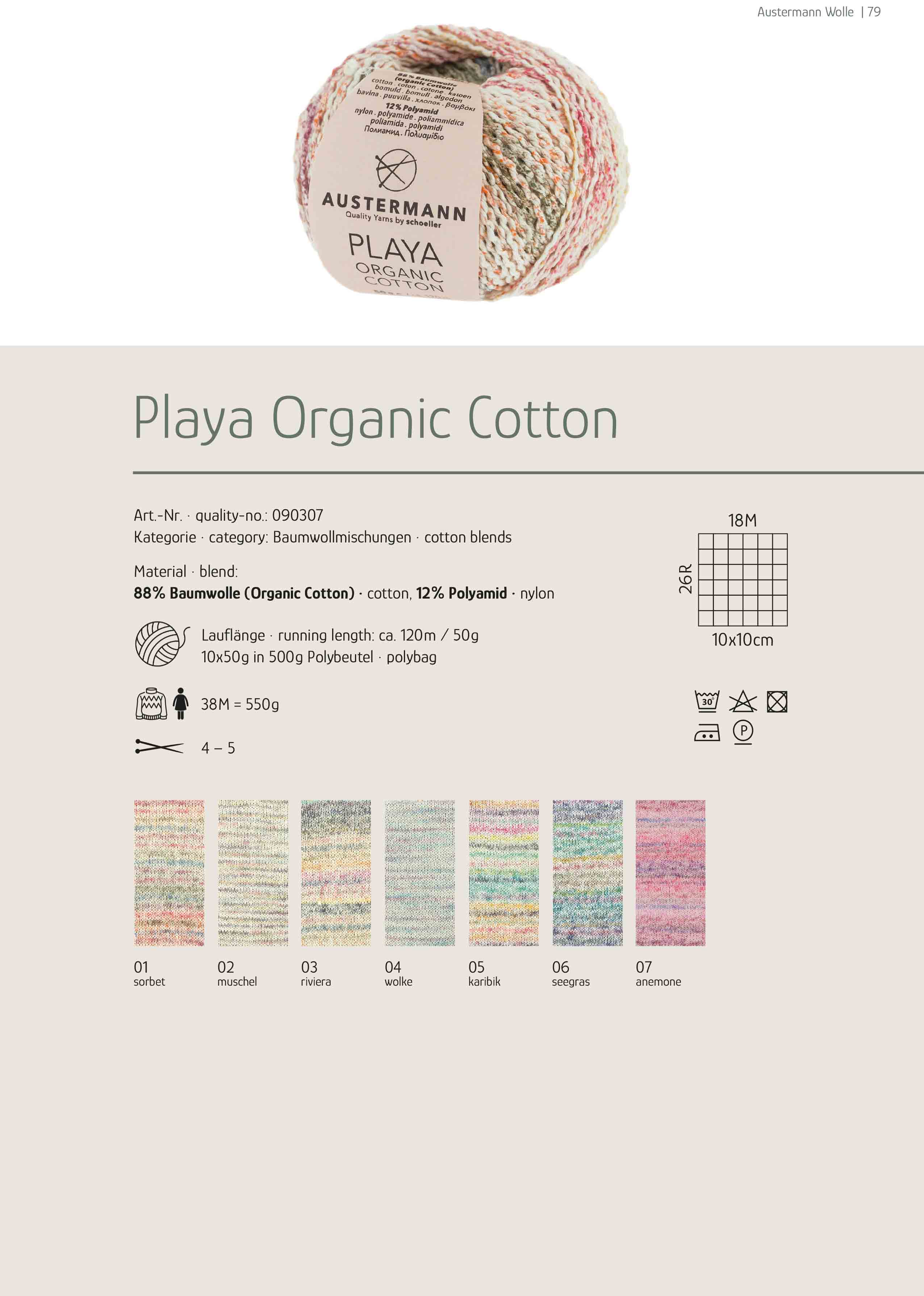 Zusammensetzung:88% Baumwolle (organic Cotton)12% PolyamidLauflänge: 120 m / 50 gNadelstärke: 4,0 - 5,0 mm